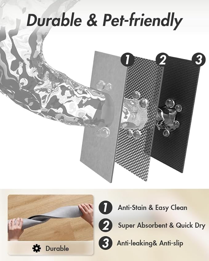 • Super Absorbent & No Stains: Special absorbent surface hide any messy stains completely.​ Magic pet food mat catch every drip off pets' chin around the pet water or food bowl. Prevent Say goodbye to spread stains and messy feeding area.