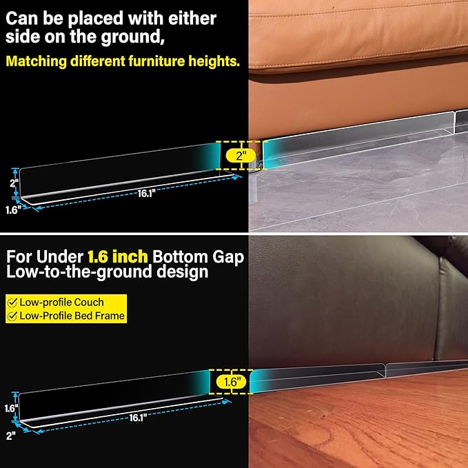 - 【Transparent Design Versatile Configuration for Any Space】: These clear blockers adapt to different furniture gaps with two placement styles. Set them with the longer side down for broader gaps or the shorter side for taller barriers, blending seamlessly with your home decor and serving as unobtrusive organizers