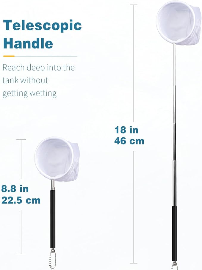 - Telescopic Handle: The stainless steel handle is 5.3 inches long when closed and 15.5 inches long when extended. The rod is stiff and uneasy to get bent or rusty. Easily reach deep into the tank without getting wetting.