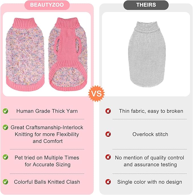 BEAUTYZOO Cable Knit Small Dog Sweater, Color Block with Fuzzy Thread Knitted Turtleneck Dog Knitwear with Dots in a Variety of Colors for Small Medium Dogs Fall Winter Dog Clothes, S Pink