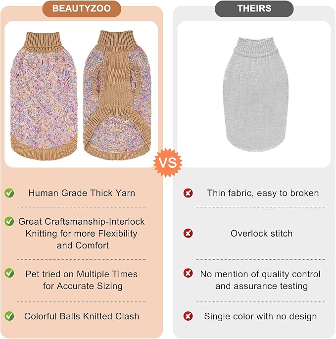 BEAUTYZOO Cable Knit Small Dog Sweater, Color Block with Fuzzy Thread Knitted Turtleneck Dog Knitwear with Dots in a Variety of Colors for Small Medium Dogs Fall Winter Dog Clothes, SM Beige