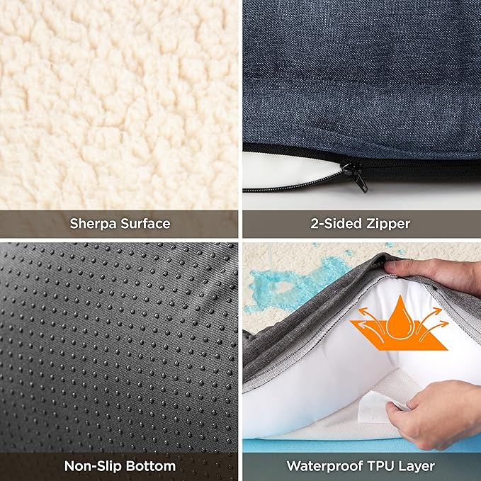- Waterproof & Easy Care: The sherpa surface of this dog bed comes with an added TPU layer, creating a waterproof barrier to fully protect the foam from spills, water damage, or accidents. Remove the zippered cover in seconds and machine wash for easy care.