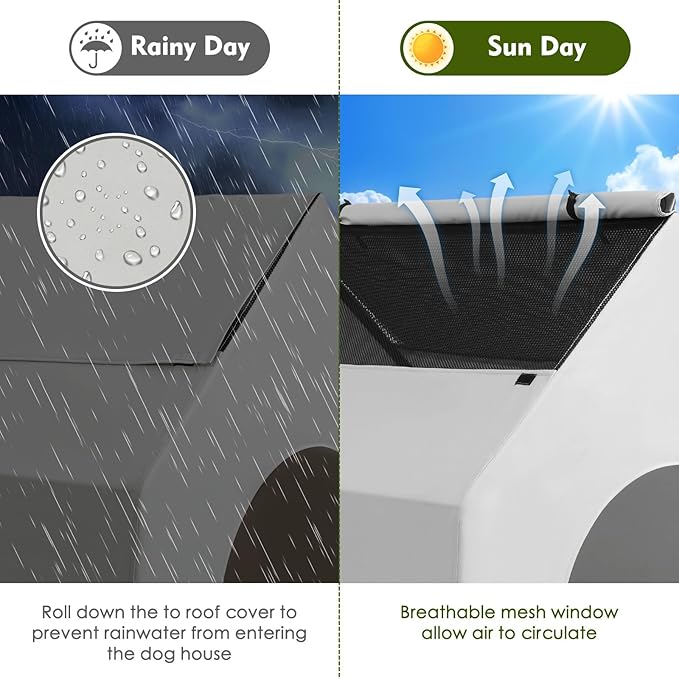 - UV Protection & Weatherproof: There are 2 windows on the top of this outdoor dog house, the roof cover can be rolled up in sunny days to help pets breathe fresh air and at the same time protect them from UV rays; In rainy days, you can roll down the cover and fixed it with Velcro. Suitable for sunny days, rainy days, summer, winter all kinds of weather and season use.
