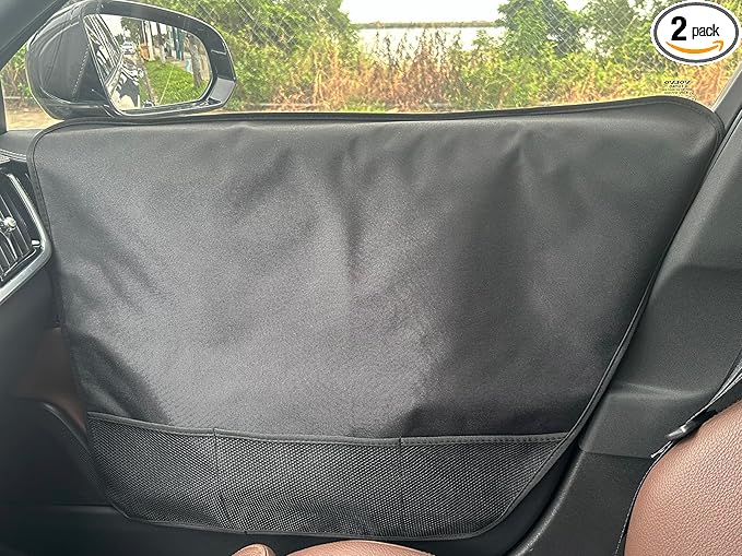 - 🐶[EASY TO ENSTALL PET CAR DOOR PROTECTOR] Our Pet Car Door Protector is easy to install. 1) Insert 4 ABS made tabs (Inserts) between window and Car Door Panel (No worries about scratching the window or tint.). 2) Use Velcro tapes at the bottom to hold it firmly. Free to roll up and down the windows after installation. The 3 storage mesh pockets on the Pet Vehicle Door Protector can be easily used for Snacks, Pet Toys, and other Travel Essentials.