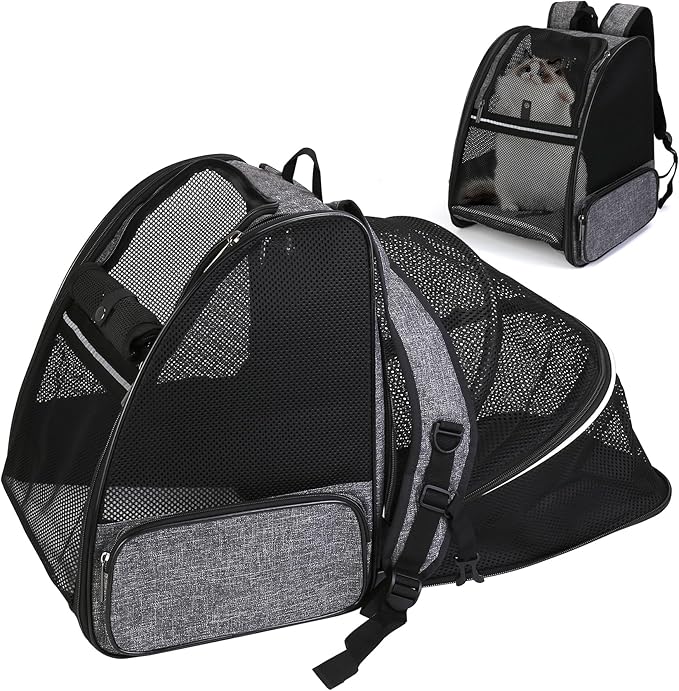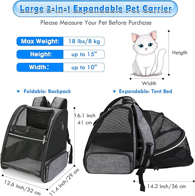 - Large & Expandable: Measures 12.6'' L x 11.4'' W x 16.1'' H. Perfect for dogs up to 15-pounds, or cats up to 18-pounds. The back panel of pet backpack can be expaned to be a giant tent bed for your furry friends to enjoy outdoor time and alleviate anxiety.