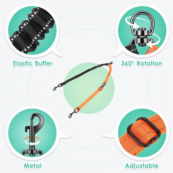 - ELASTICITY & SHOCK ABSORPTION --- Our split lead for two dogs applies a comfortable shock-absorbing bungee design, doubled elastic for the larger dogs, to protect from sudden moves and strong pulling, reduce the pain of dragging dogs and owner.