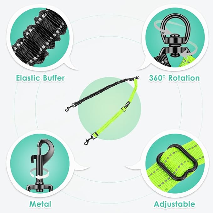 - ELASTICITY & SHOCK ABSORPTION --- Our split lead for two dogs applies a comfortable shock-absorbing bungee design, doubled elastic for the larger dogs, to protect from sudden moves and strong pulling, reduce the pain of dragging dogs and owner.