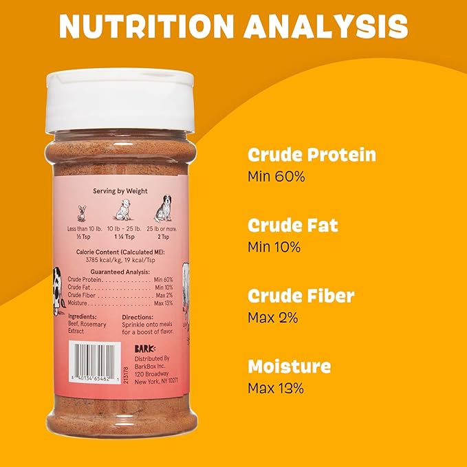 - Protein-Packed Goodness: Embrace the power of protein with BarkBox meticulously crafted beef topper. Formulated with only 2 key ingredients – premium beef and aromatic rosemary – this blend brings together a symphony of taste and nutrition providing an allergy friendly option. Elevate your pup's meal with high-quality protein, ensuring they receive both the flavor they crave and the essential nourishment they need.