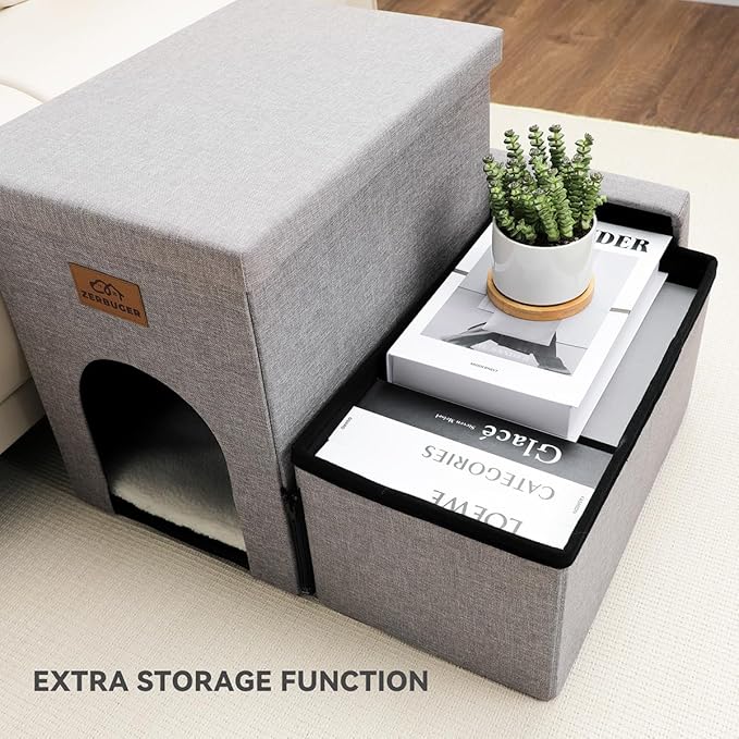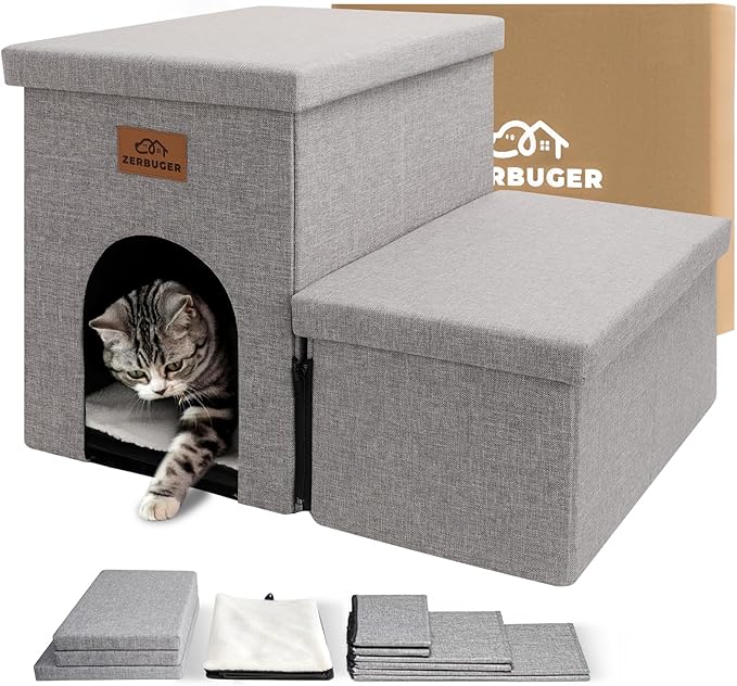 - 🐾【3-IN-1 DOG STAIRS AND CONDO】: These Zerbuger pet stairs not only provide a stable and cozy place for your pet to rest, but also serve as a convenient storage area for your pet's clothes, toys, or any other supplies. The pet steps are covered with removable lids, Every steps are designed as storage boxes.