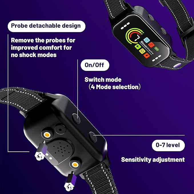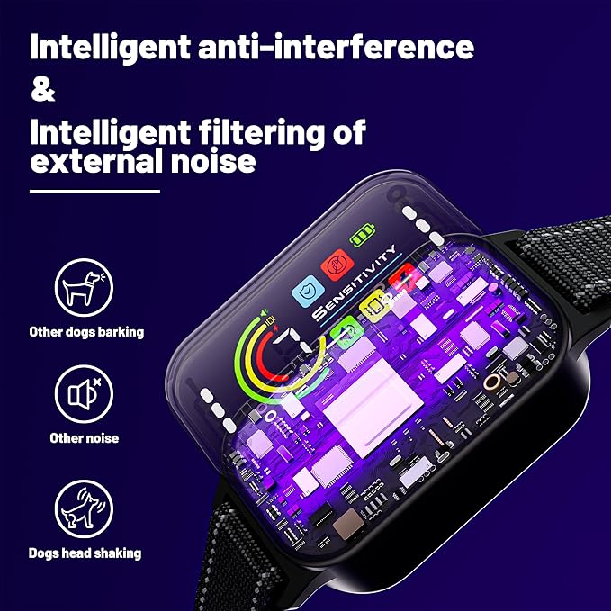 - 🌎【Upgraded Technology, No More False Triggering】collar features four smart AI safety training modes and smart bark collar for dogs adopts advanced dog bark recognition chip and motion detection technology. It includes a no shock mode with beep, vibration, beep+vibration; and a shock mode with beep+vibration+shock. With adjustable sensitivity ranging from 0-7, this feature enables bark collar to effectively correct a dog's bad habits.