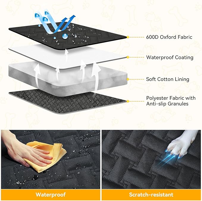 - 【Premium Material】This dog seat cover for the back seat boasts a 4-layer design, featuring 600D Oxford fabric, waterproof coating, soft cotton lining, and polyester fabric with anti-slip granules. It's not only waterproof and scratch-resistant but also incredibly easy to clean, ensuring your car stays in top-notch condition.