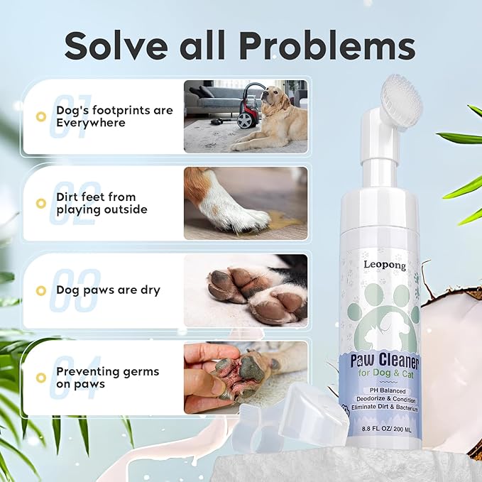 - 【Waterless Paw Cleaner for Dogs】Our natural formula provides quick and effective cleaning to keep your furry friend healthy and clean. Gently massage with paw cleaner and wipe off with a towel. No need to rinse with water. The removable silicone brush head is easy to clean and maintain.