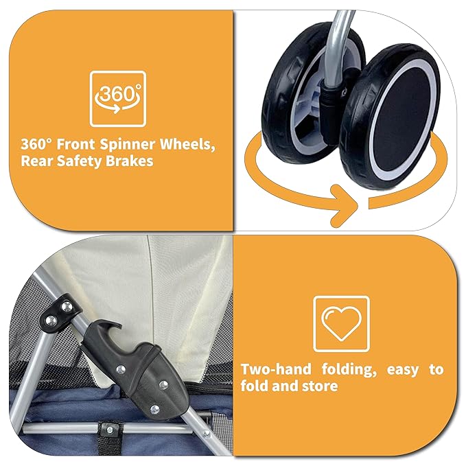 - 【Durable Wheels】: The front wheels are double wheels and can be rotated 360° without dead ends. The rear wheels have brakes for safer travel. 5” wheels of our cat stroller glide easily over smooth or rough terrain