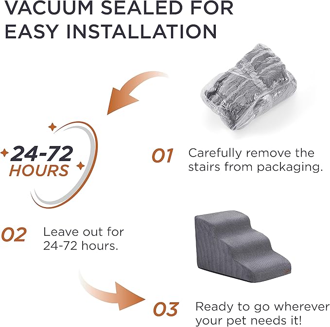- Convenient & Easy to Use: Thoughtfully designed with your furry friend's needs in mind. A non-slip bottom featuring rubber dots ensures secure footing, while the handy built-in handle allows you to effortlessly move the ramp as needed. Note: the ramp arrives vacuum-compressed and requires no assembly. Simply give it 24-72 hours to fully expand and offer the utmost comfort for your pets.