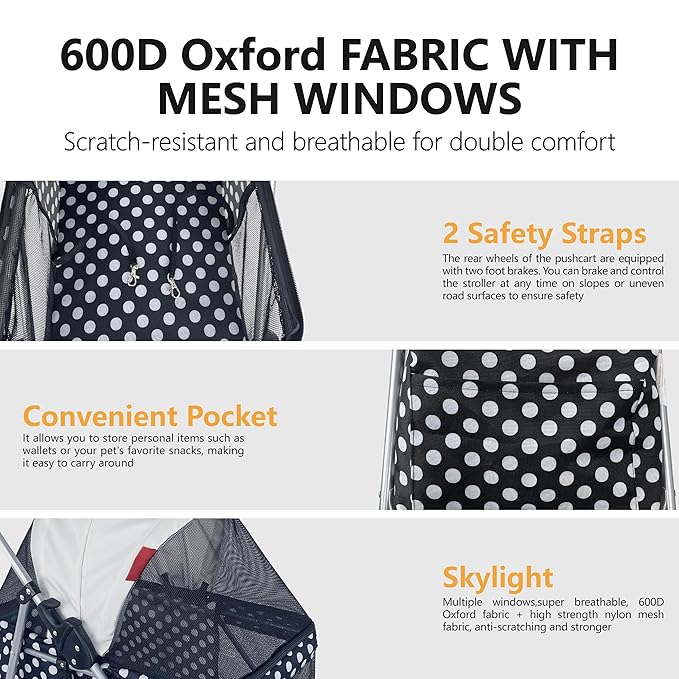 4 Wheels Posh Foldable Pet Stroller for Medium Small Dogs/Cats 33lbs(Black Dot)