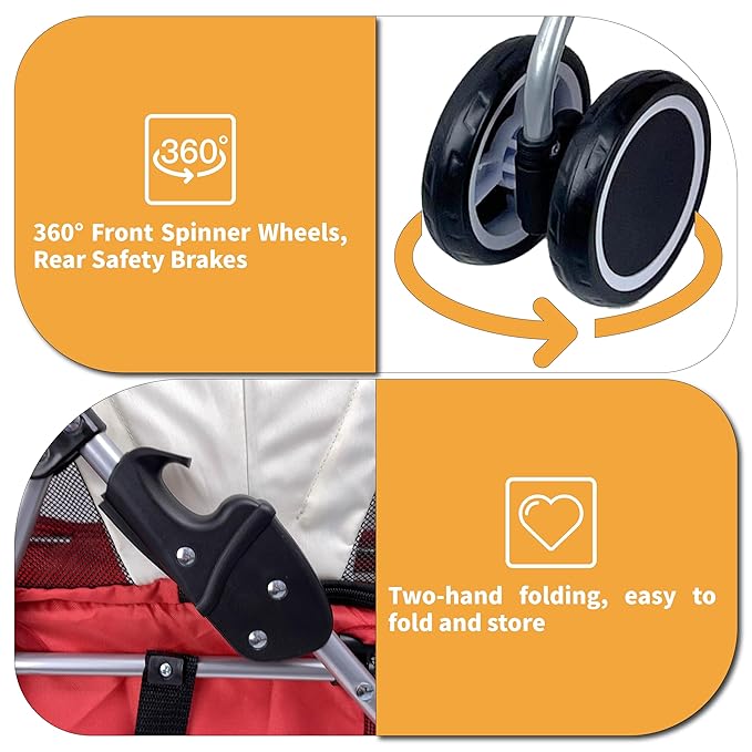 - 【Durable Wheels】: The front wheels are double wheels and can be rotated 360° without dead ends. The rear wheels have brakes for safer travel. 5” wheels of our cat stroller glide easily over smooth or rough terrain