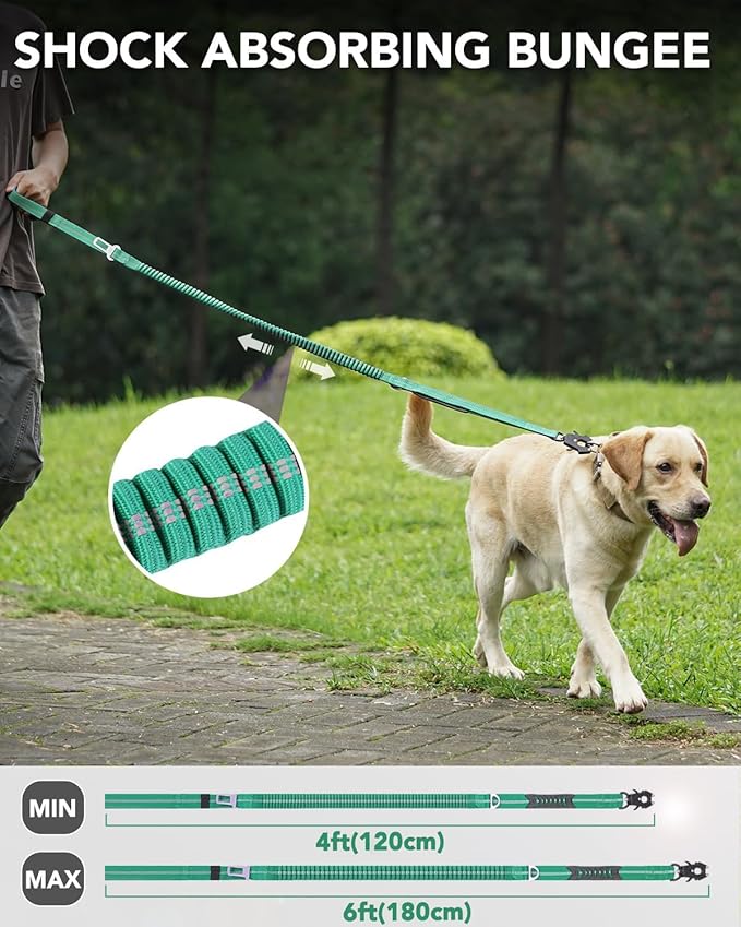 - Shock Absorbing Bungee Leash: This bungee dog leash allows just enough length for the dog to wander and explore while we’re walking but not so much that the leash drags on the ground. The springy design of the leash really absorbs the pull from large energetic energetic and strong dogs without tugging on your wrist and shoulder. It has a good stretch to ease the pressure for both the owner and the dogs to make your walks much more enjoyable