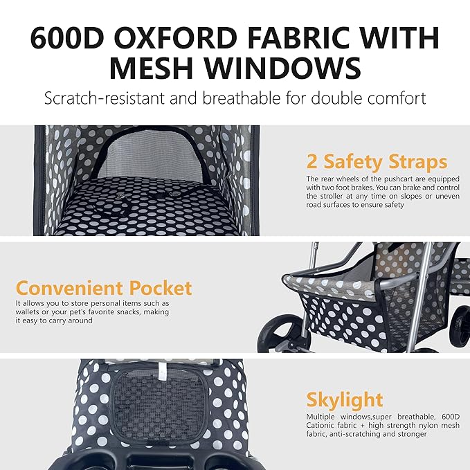 - 【High Quality Waterproof Material】This pet stroller is made of 600d waterproof Oxford cloth, which is water resistant and durable. This durable 4-wheeled stroller makes for a safe and smooth ride and it is perfect to hold any pets weighing up to 33 lbs