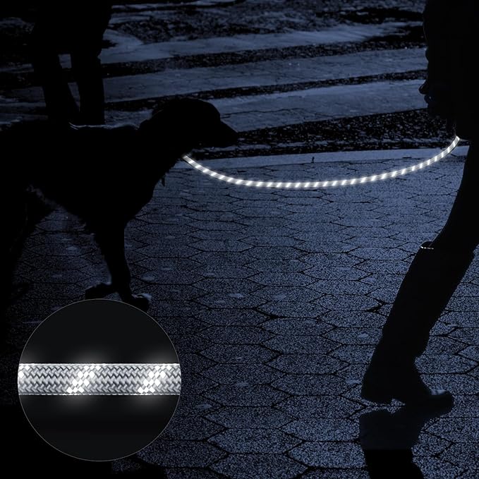 - 【Becoming Safe and Visible】Enjoy a reassuring walk with this reflective dog leash. Highly reflective threads rope dog leash keep you safe and visible because of passing cars, cyclists, and pedestrians will spot you from a distance preventing you and your pet from being harmed.