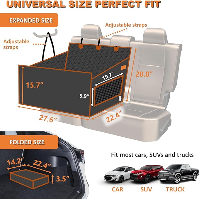 - 【Suitable For Various Sizes Of Dogs】The size of dog backseat extender is 27.6*22.4*21.0 inches. Hard bottom dog hammock for car are suitable for almost all sizes of dogs. The back seat extender is suitable for small to large-sized dogs. Two seat selts are included, two small dogs can be rest on the pet car seat together if space is enough. Our car dog seat is designed to be suitable for most cars suvs and trucks.