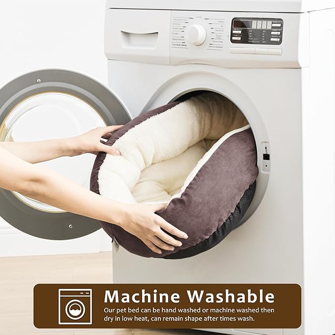 • Donut Cuddler Shape: The round dog bed allows pets to curl up while the raised rim creates a sense of security and provides head and neck support. Premium ultra-soft filling offers joint and muscle pain relief.The 20 inch round pet bed is perfect for cats, small dogs and other pets up to 15 lbs.