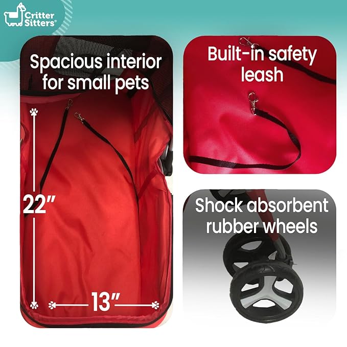 Critter Sitters 4-Wheel Dog Stroller for Small or Medium Sized Dogs and Cats with Scratch Resistant Breathable Mesh Windows and Safety Leash