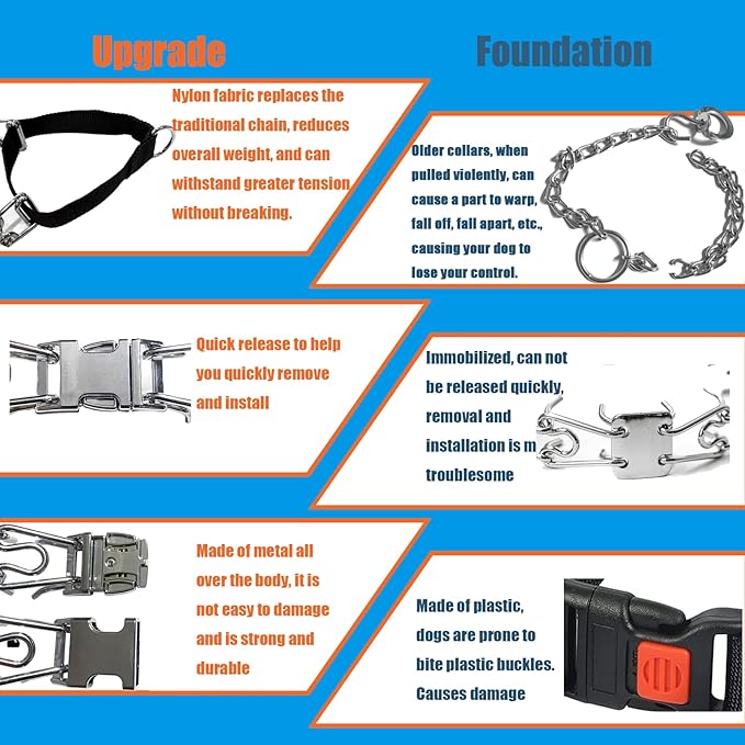 - ☑️ 【UPGRADED NYLON CLOTH】: This dog collar replaces the traditional chain with stronger nylon cloth with metal D-ring at the leash joint. While reducing the overall weight, it can also withstand stronger tension without breaking. I am sure your partner will like this collar more.