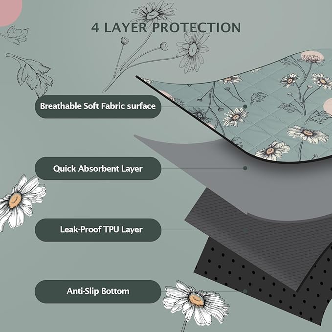 - 【Fashion and Non-slip】 Our daisy design makes this reusable pee pads for dogs very cute and makes your room more stylish. And the soft and comfortable puppy pee pads with anti-skid bottom can achieve a certain fixed effect.The bottom is waterproof and you can place it anywhere you want.