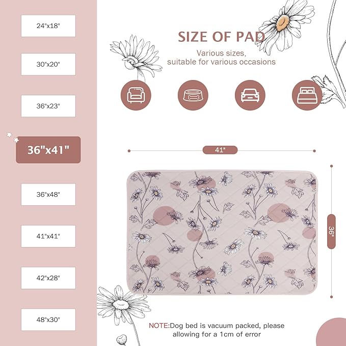 - 【Fashion and Non-slip】 Our daisy design makes this reusable pee pads for dogs very cute and makes your room more stylish. And the soft and comfortable puppy pee pads with anti-skid bottom can achieve a certain fixed effect.The bottom is waterproof and you can place it anywhere you want.