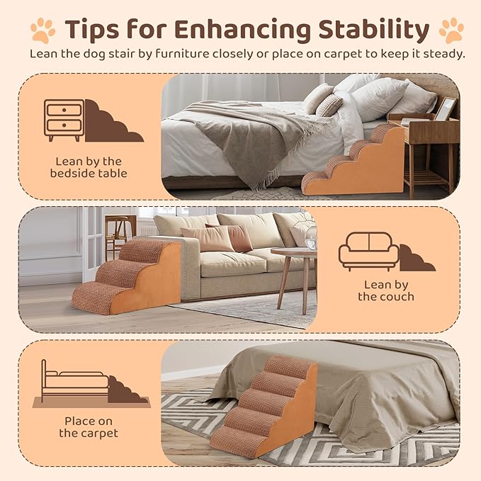 - 🐇Supportive & Steady: These pet stairs for large dogs adopt with 30D high-density pure foam, featuring supportive and lightweight. Generally, it can provide stable support for small/medium-sized dogs and other pets under 45 lbs. The non-slip corduroy pet stair cover increases extra grip while in use. The bottom features non-slip rubber dots, preventing pets from sliding while climbing up and down.