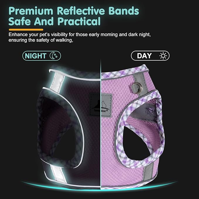 - Reflective & Adjustable Puppy Dog Harness; Super 360°highly reflective strips is designed to reflect ambient light under extreme low light conditions, it can provide maximum visibility when dogs walking at night. Our No-Choke dog harness can distribute the pulling pressure evenly to the dog’s body and protect dog's trachea and throat from pulling and choking.