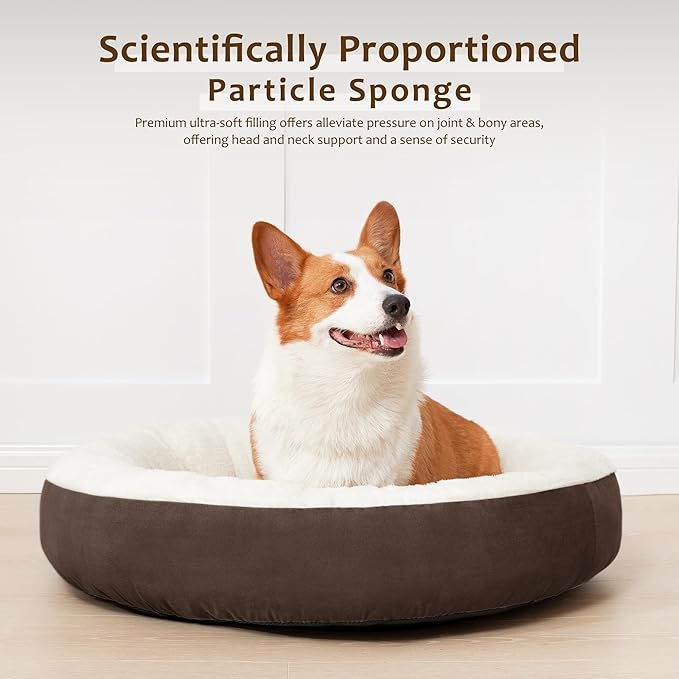 • Donut Cuddler Shape: The round dog bed allows pets to curl up while the raised rim creates a sense of security and provides head and neck support. Premium ultra-soft filling offers joint and muscle pain relief, is a great choice for elderly or sick dog pets. The 25 inch round pet bed is perfect for cat or puppy and other pets up to 30 lbs.