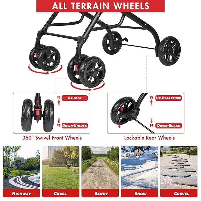 - UPGRADED WHEELS: This pet stroller is easy to maneuver, there is a foot brake on the back axle, the front wheels are casters make it turns well and stops flexibly. In addition, shock absorbing springs are mounted on the front wheels which suitable for a wide range of road surfaces and make it more comfortable for your pets.