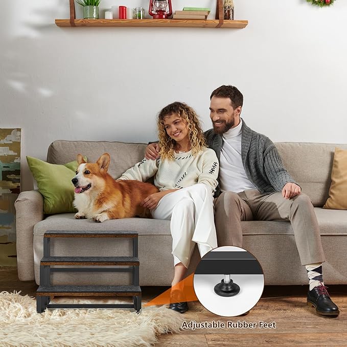 - 【Stable & Sturdy】: OYEAL 3-tier dog stairs are crafted from sturdy particle board and metal material. Specially designed with a sturdy triangular structure to withstand the weight of large dogs( Maximum weight capacity: 100 pounds) . Besides, Each step of the pet stairs is covered with a grip-enhancing thread to avoid slipping, sliding, and potential injuries during movement and climbing.