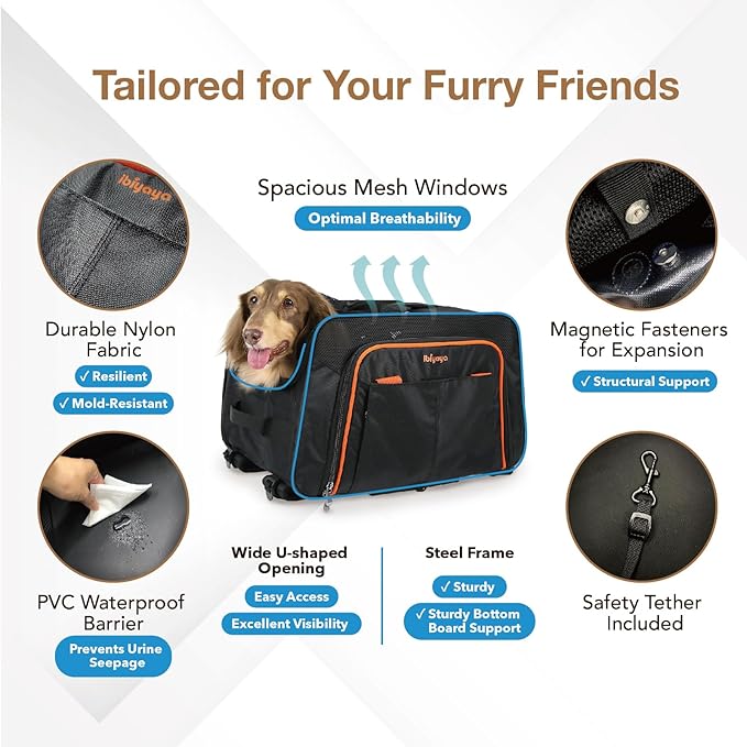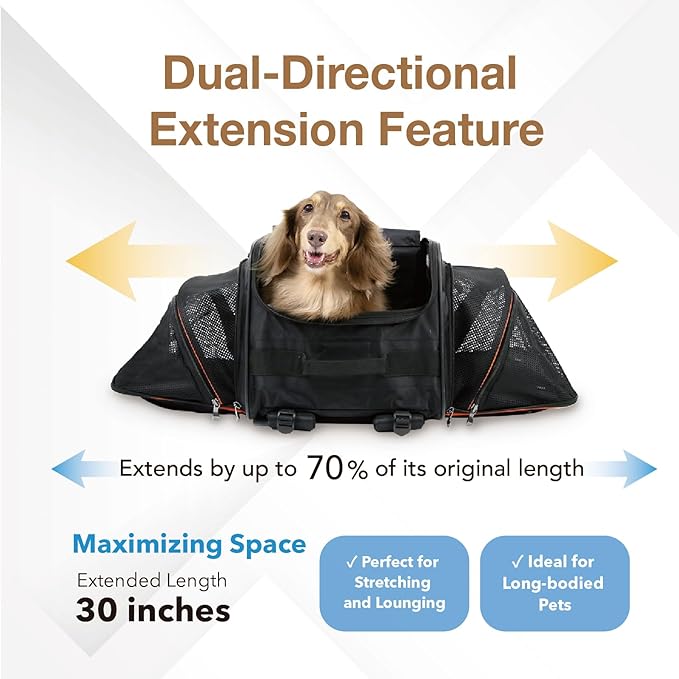 - EXPANDABLE SPACE FOR COMFORT: Unique design expands up to 70% in length, providing extra space and comfort for longer breeds to stretch and relax during travel.