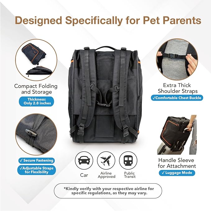- ENHANCED SAFETY AND CONVENIENCE: Equipped with an auto-locking zipper, safety tether, ergonomic straps with a chest strap, and luggage sleeve for secure attachment to suitcases, ensuring your pet's security and your ease of travel.