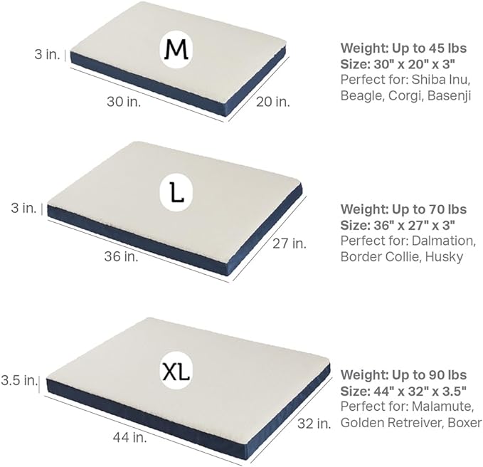 • The orthopedic foam dog bed measurement: M: 30"x20"x3" / Up to 45 lbs, L: 36"x27"x3" / Up to 70 lbs, XL: 44"x32"x3.5" / Up to 90 lbs