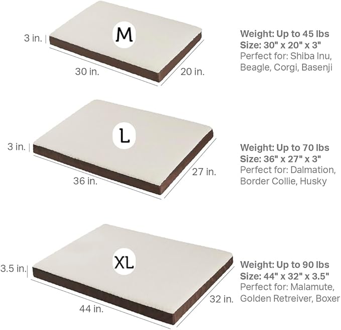 - The orthopedic foam dog bed measurement: M: 30"x20"x3" / Up to 45 lbs, L: 36"x27"x3" / Up to 70 lbs, XL: 44"x32"x3.5" / Up to 90 lbs