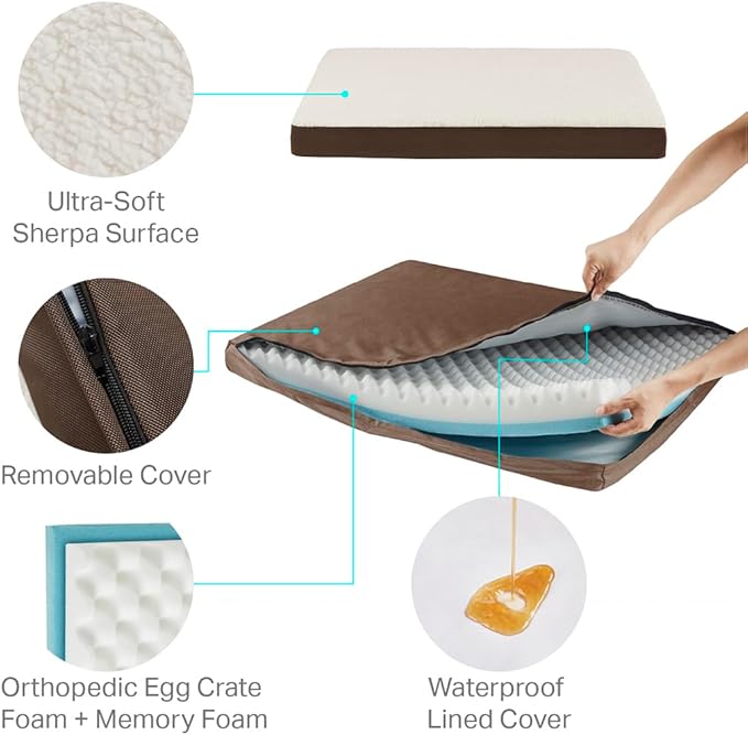 - 2 Layer foam base: Top 2.5" orthopedic egg crate foam (3" for XL size) and bottom 0.5"memory foam evenly distributes body weight and soothes pressure points to provide maximum support for dogs and cats of all ages, especially pets with joint pain or arthritis, and improves air circulation to keep cool in the hotter months.