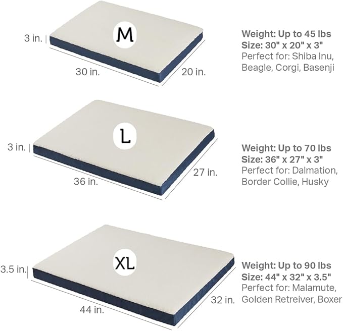 - The orthopedic foam dog bed measurement: M: 30"x20"x3" / Up to 45 lbs, L: 36"x27"x3" / Up to 70 lbs, XL: 44"x32"x3.5" / Up to 90 lbs