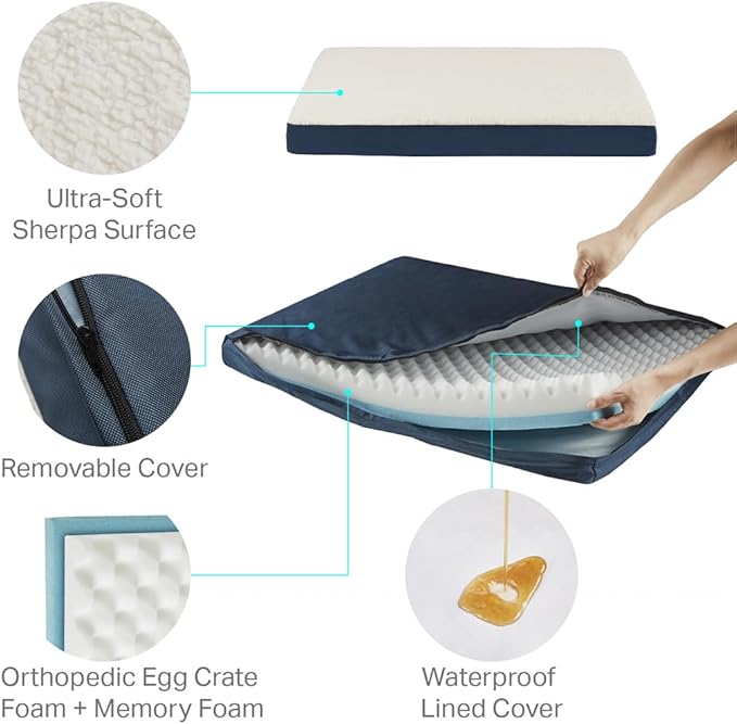 - 2 Layer foam base: Top 2.5" orthopedic egg crate foam (3" for XL size) and bottom 0.5"memory foam evenly distributes body weight and soothes pressure points to provide maximum support for dogs and cats of all ages, especially pets with joint pain or arthritis, and improves air circulation to keep cool in the hotter months.