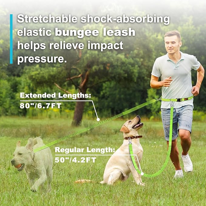 - [Elastic Bungee Dog Leash] The design of the elastic bungee dog leash allows the elastic length range of this hands free dog leash to vary freely between 4.2-6.7 feet. This allows your pet to have a free range of movement without worrying about stepping on her/his paws or running too far out of your control.