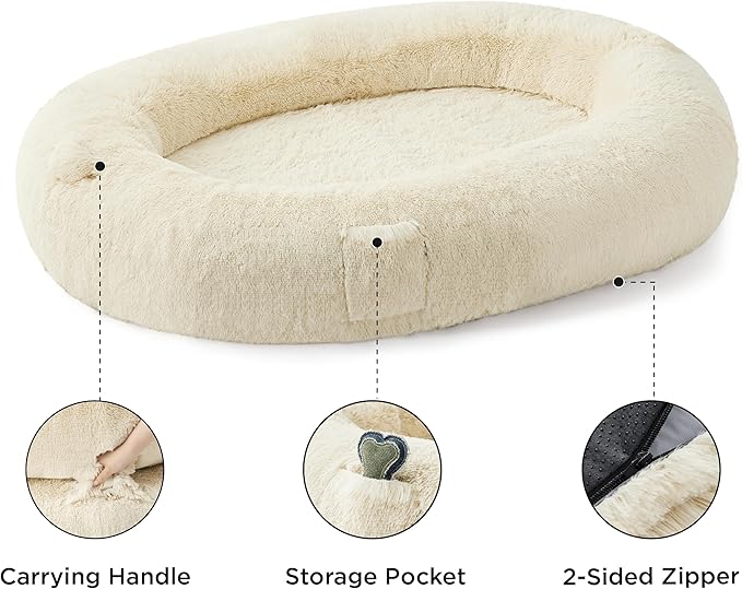 • Versatile and Spacious: Step into a world of unprecedented comfort with our human dog bed for people adults, designed specifically to help you relax and destress from daily life. This cozy retreat provides ample room for cuddling, napping, reading a book, or playing games in your living room, bedroom, or office. Plus, it's portable enough for outdoor picnics or camping. It includes two side handles with velcro for easy transport and a handy pocket to store essentials.
