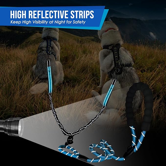 - 【Reflective Strips】 --- We've added reflective strips to both the individual bungee leash and the main rope of our double dog leash. These strips ensure that you and your pets are visible during nighttime walks, providing an extra layer of safety and peace of mind. With our leash, you can enjoy walks with your furry friends, day or night.