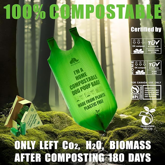 - 🌱100% COMPOSTABLE: Our certified home compostable dog poop bags with handles are 100% plastic free, no PE or heavy metal, meet TÜV ok home compostable, ASTM D6400 & EN13432 compostable standard.
