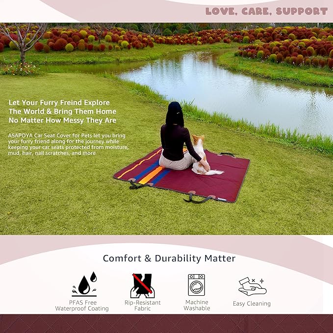 - Spacious And Stylish: ASAPOYA waterproof pet car set cover offers versatile use as a hammock-style cover for full car protection. It's adjustable for bench-style seating with your dog, doubles as a cargo liner, and serves as a picnic mat for outdoor use. It's available in 2 stylish and modern colors including Bordeaux Red and Prussian Blue with signature stripes and leather accents