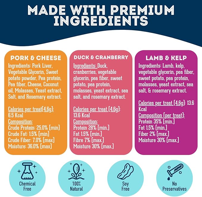 - NATURAL TREATS FOR DOGS & CATS HIGH IN PROTEIN IN 3 GREAT FLAVORS - Our treats for dogs are 100% natural, filled with nutrient-rich pork, lamb, and duck meat. Packed with Omega 3s, vitamins and minerals such as Iron, Zinc, and Vitamin D, these cat and dog snacks are chemical-free with zero additives or preservatives, making them the ultimate choice for cat treats and dog treats alike. With these soft and chewy dog treats your furry family will receive the finest in nutritional support!