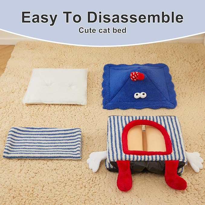 - 【Cute Cat Bed】The cat houses for indoor cats are lovely and have the unique design. The cat beds feature the shape design of cartoon cat house bed with eyes and two tiny feet. The covered cat bed provides your furry friend with a comfortable resting spot.