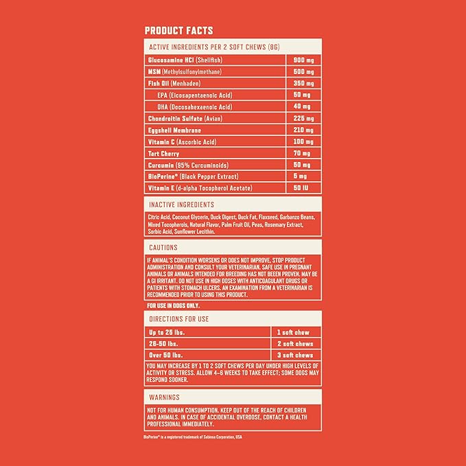 - Better Ingredients, Better Results: Our formula includes premium-grade Glucosamine HCL, Chondroitin, and MSM, all vet-recommended ingredients for joint health; We didn’t stop there, we included eggshell membrane to promote cartilage health and BioPerine to increase bioavailability of other ingredients; And as for curcumin, the active agent in turmeric—ours is a 95% pure extract that contains up to 31 times more than standard turmeric used by other brands