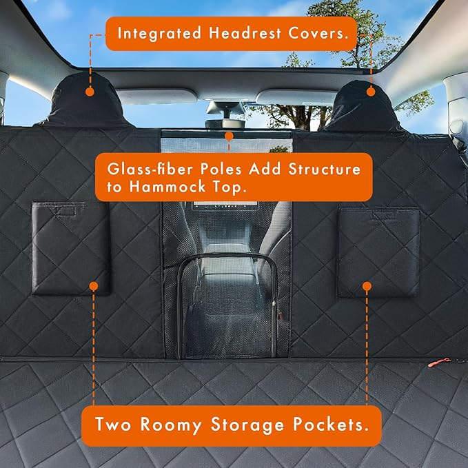 - 【Removable Dog Car Back Seat Cover】It can be used in Model Y back seat or trunk. The mesh window with zipper design allows people and pets to sit in the back seat together. The thick and soft cushion brings a comfortable riding experience for your pet.